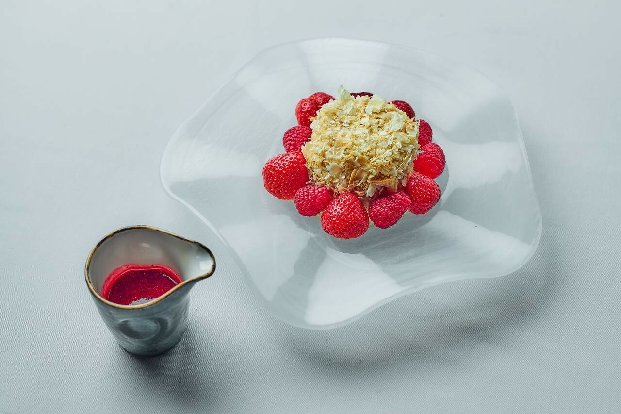 Кутаб с тыквой (мука пшеничная, соль, масло, тыква, мёд, гель нейтральный, молотая корица), крем мацони (мацони, молоко сгущёное, желатин, текстура ксантан, сливки 33%).