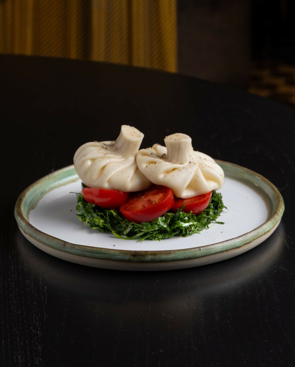 Хинкали с постным сыром на карпаччо из томатов и зелени
