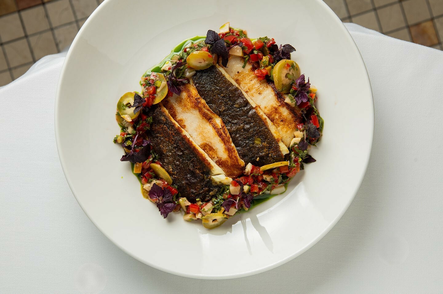 Филе камбалы на гриле с рублеными томатами и белыми грибами
