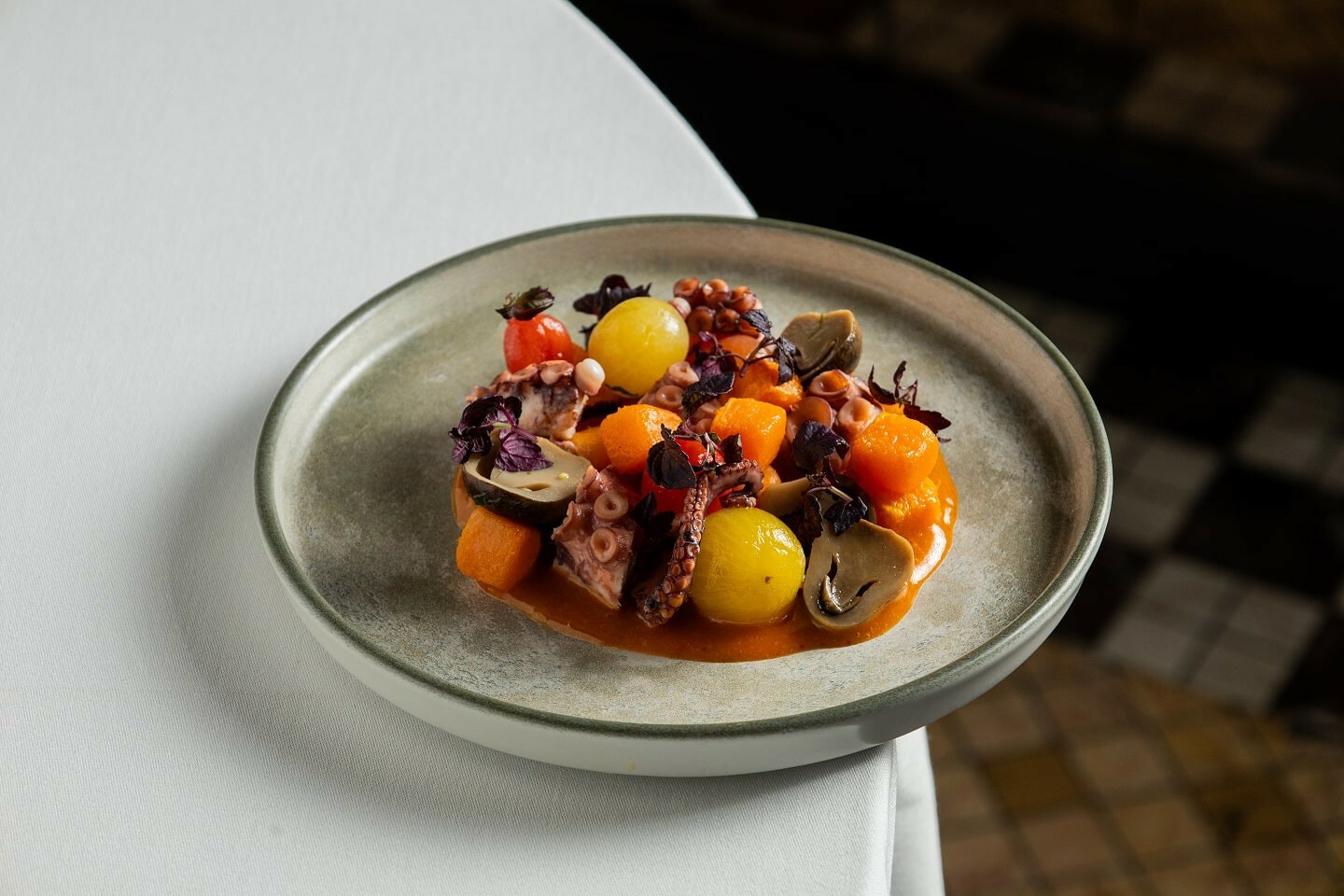 Салат с осьминогом,жареным бататом и грибами Цао Гу